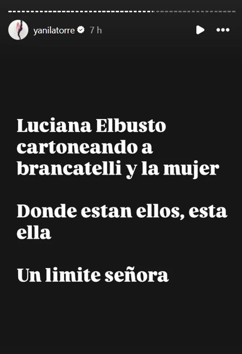Y luego llevó el tema a sus Historias de Instagram, detallando aún más los movimientos de la rubia: «Luciana Elbusto cartoneando a Brancatelli y la mujer. Donde están ellos, está ella. Un límite señora», posteó.