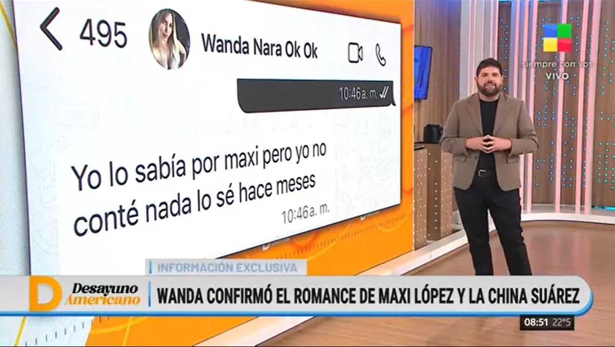 Bomba: en Desayuno Americano se mostró una reveladora charla donde Wanda Nara confirma el affaire entre Maxi López y la China Suárez, actual novia de Mauro Icardi.