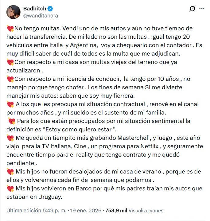 En un descargo que publicó en su cuenta de X, la mediática aclaró uno por uno los rumores que la persiguen desde su llegada a Buenos Aires: desde su relación amorosa actual, hasta unas supuestas multas por no pagar la patente de sus autos.