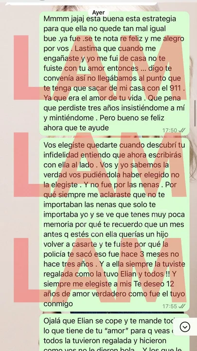Además, señaló que seguramente ahora él escribe con su novia al lado: “Vos y yo sabemos la verdad, vos pudiéndola haber elegido, no la elegiste… Y no fue por las nenas”. “Porque siempre aclaraste que no te importan las nenas que solo te importaba yo”, recordó.
