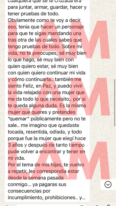 “Hace tres años me quise separar por la mujer con la que estoy hoy…pero si, ahí pensé en mis hijas y te di otra oportunidad cuando viniste rogándome”, le recriminó. “Seguí tres años mientras me cagabas con cualquiera que se te cruzaba para juntar, armar, guardar, hacer y tener pruebas de todo. Obviamente, ¿cómo te voy a decir eso? Tenía que hacer un personaje que te sigas mandando una tras otra”, continuó.
