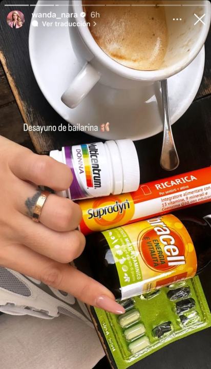 Lo cierto es que Wanda Nara compartió una foto de su desayuno y sobre la mesa, además de un café, se veían cuatro tipo de medicamentos y vitaminas que tenía tomar debido al esfuerzo físico que esta haciendo. «Desayuno de bailarina», describió en la historia.
