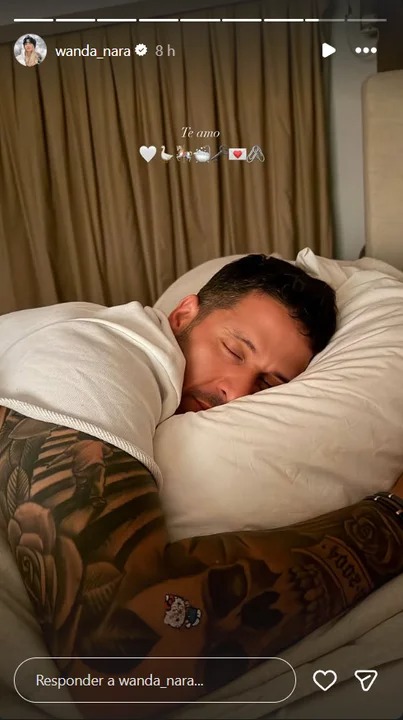 Desde la cama de su habitación en el Chateau Libertador, Wanda Nara publicó una foto de su pareja, Martín Migueles, durmiendo junto a ella.