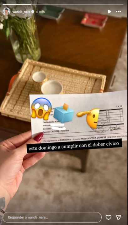 Wanda Nara será autoridad de mesa en las elecciones 2025. Tras recibir la notificación, la mediática confirmó que cumplirá con su deber cívico. En sus historias de Instagram, la conductora de MasterChef Celebrity (Telefe) compartió una foto en la que se veía el papel donde la notificaban para ser presidente de mesa.