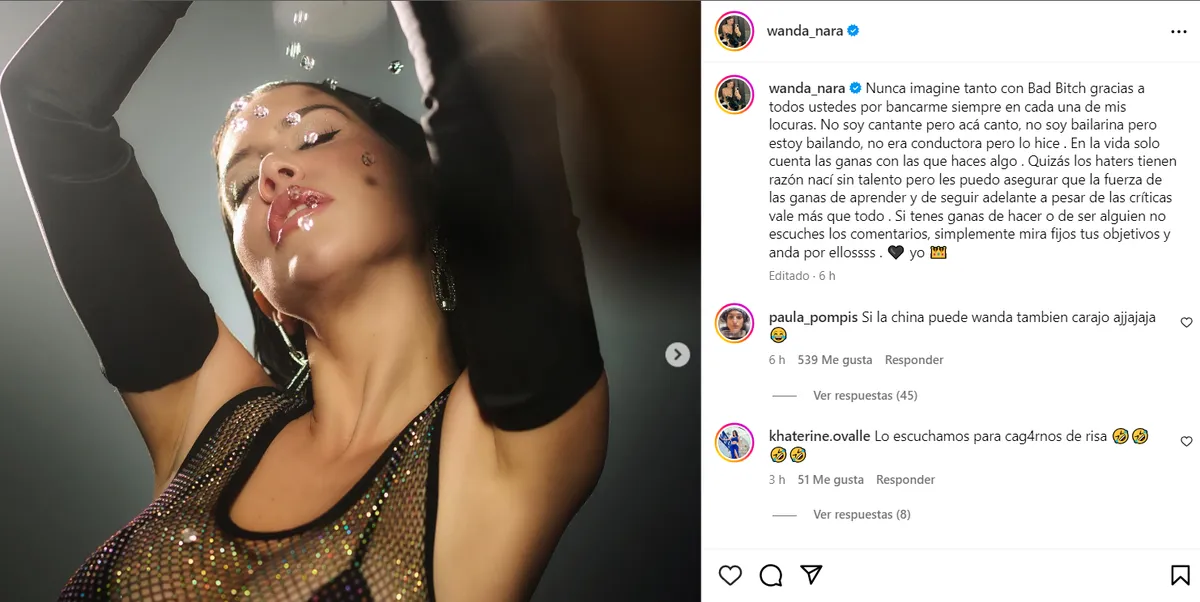 «Nunca imaginé tanto con Bad Bitch gracias a todos ustedes por bancarme siempre en cada una de mis locuras. No soy cantante pero acá canto, no soy bailarina pero estoy bailando, no era conductora pero lo hice. En la vida solo cuenta las ganas con las que haces algo», comenzó escribiendo en sus redes sociales.