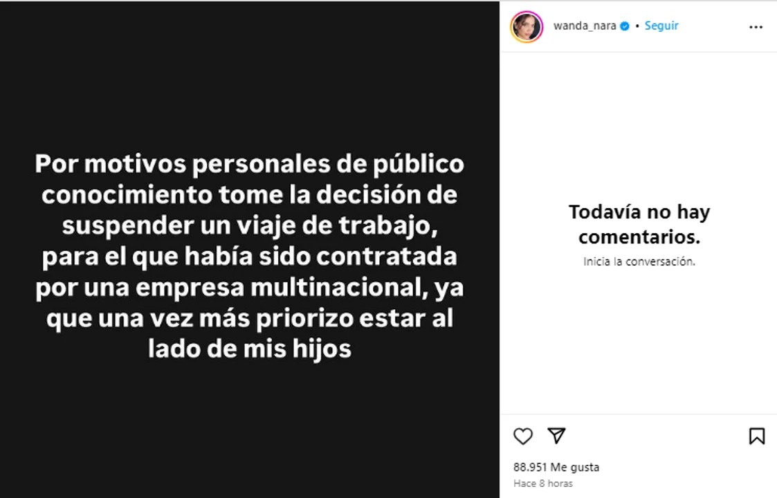 “Por motivos personales de público conocimiento, tomé la decisión de suspender un viaje de trabajo para el que había sido contratada por una empresa multinacional, ya que una vez más priorizo estar al lado de mis hijos”, escribió.