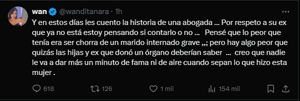 En uno de sus tuits, Wanda jugó al enigmático: «En estos días les cuento la historia de una abogada… Por respeto a su ex que ya no está, estoy pensando si contarlo o no… Pensé que lo peor que tenía era ser chorra de un marido internado grave, pero hay algo peor que quizás las hijas y ex que donó un órgano deberían saber… Creo que nadie le va a dar más un minuto de fama ni de aire cuando sepan lo que hizo esta mujer». Estas palabras, dirigidas claramente a Elba Marcovecchio, sobre lo qué podría estar ocultando la abogada de Icardi.