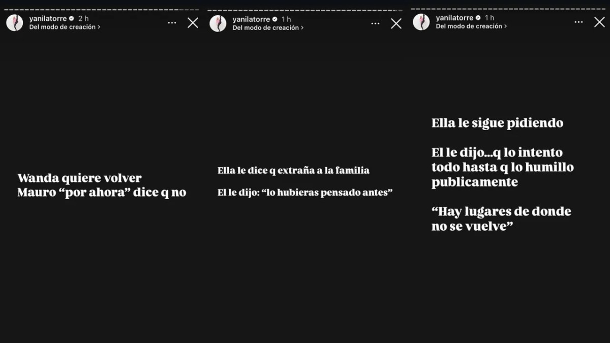 Así lo dio a conocer en sus historias de Instagram: “Wanda quiere volver. Mauro ‘por ahora’ dice que no”.