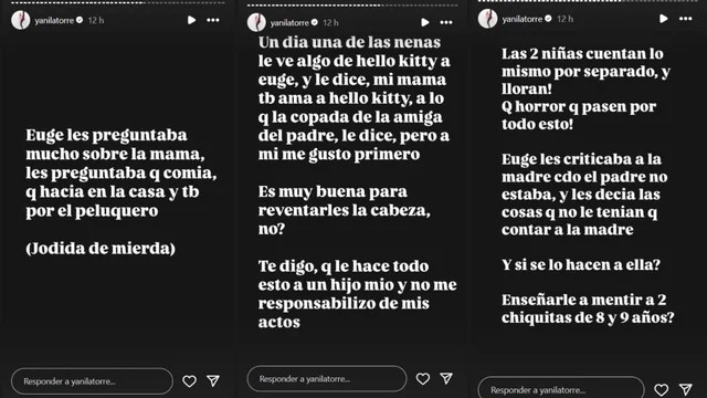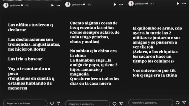 “Las niñitas tuvieron que declarar. Las declaraciones son tremendas, angustiantes, me hicieron llorar. Las iría a buscar. Cuento algunas cosas de las que contaron las niñas (como siempre aclaro, tengo pruebas, chats y audios). No sabían que la China era la China. La llamaban Euge, la amiga de papá, que tiene dos hijos, Amancio y Magnolia. Que no durmieron todos los días en la casa nueva”, explicó la influencer.