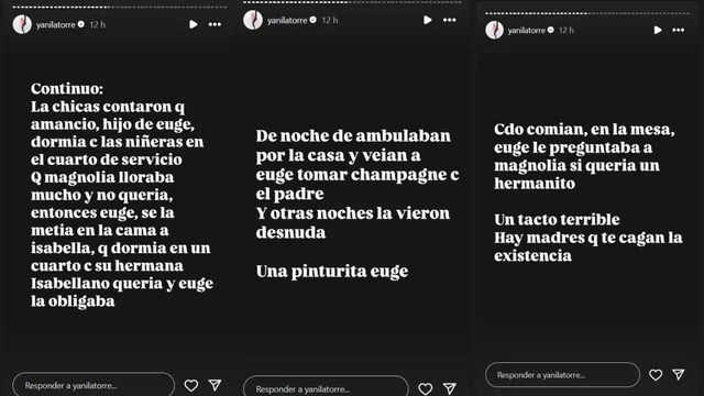 “Las chicas contaron que Amancio, hijo de Euge, dormía con la niñera en el cuarto de servicio. Que Magnolia lloraba mucho y no quería, entonces Euge se la metía en la cama a Isabella, que dormía en un cuarto con su hermana. Isabella no quería y Euge la obligaba”, contó.