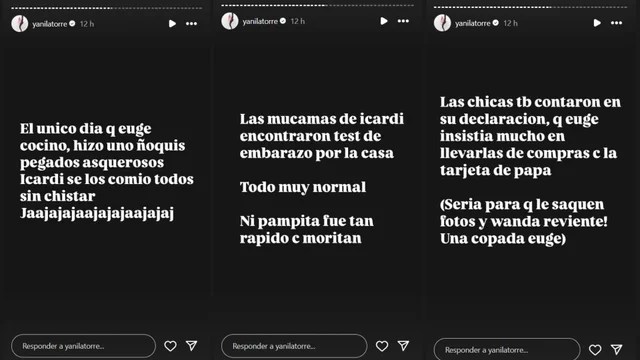 “Las mucamas de Icardi encontraron test de embarazo por la casa”, reveló, lo que sumaria a la información de que la actriz buscaría un hijo con el futbolista para sellar su relación. “Euge insistía mucho en llevarlas de compras con la tarjeta de papá”, agregó, deduciendo que sería para que la fotografíen como termino pasando.