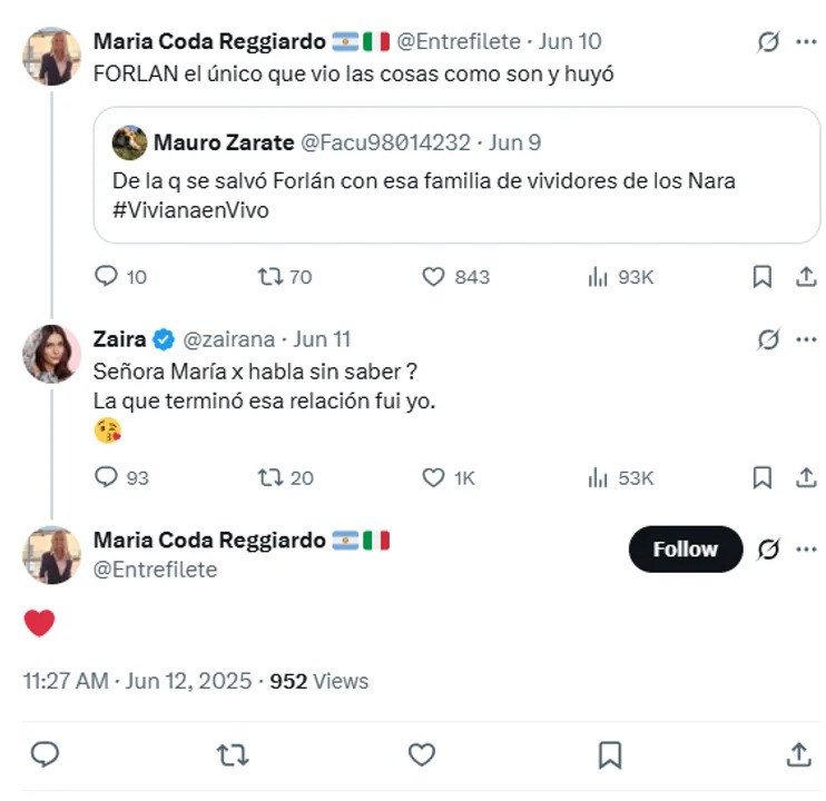 Desde un perfil de X (antes Twitter) con marcada predilección hacia Mauro Icardi y en contra de Wanda Nara, una cibernauta publicó: “Forlán, el único que vio las cosas como son y huyó”. Clara alusión a que el futbolista que fue novio de Zaira Nara-según opinión de la mujer- tendría motivos suficientes para dejar el vínculo -comparando con las separaciones de Wanda-.