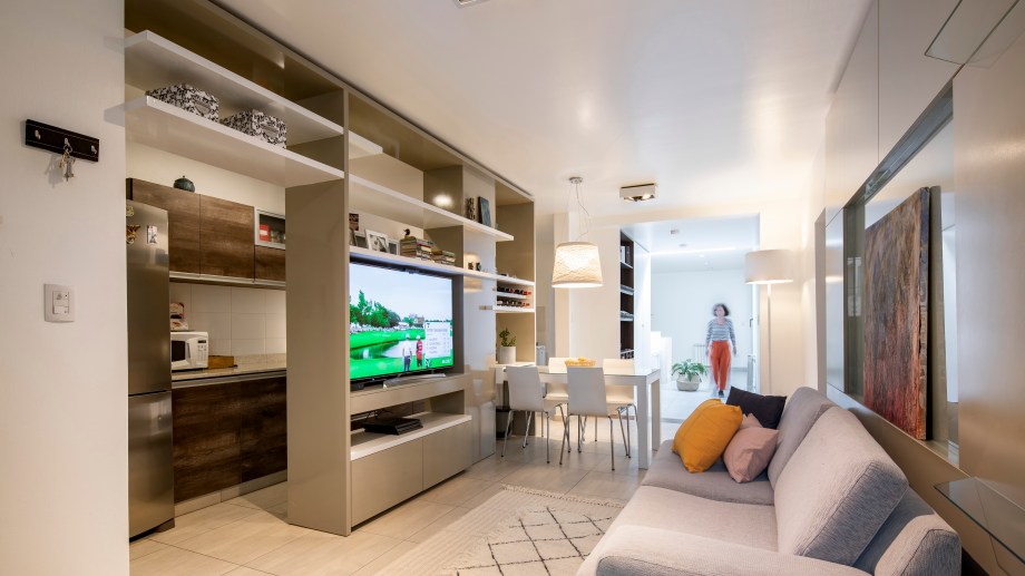 Es así que “proyectamos unos elementos virtuales tipo paneles entreabiertos que sirven para contralar las visuales desde la entrada de la casa hacia la cocina y el comedor, pero que no obstaculizaban por completo la entrada de luz ni ventilación de los mismos. A su vez complementamos esta idea con todo el equipamiento diseñado a medida con una paleta de colores neutra y suave para que generaran más amplitud y calidez que una vivienda necesita”, afirma Eugenia Bravo, la diseñadora de interiores miembro del estudio Arkiza.