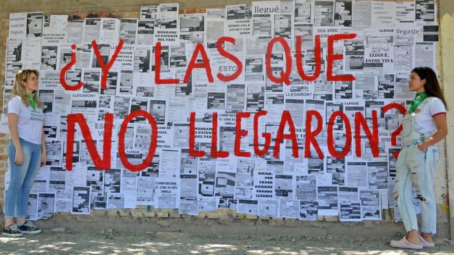 “Hola chicas me voy a ir caminando a particular que me queda a 15 cuadras les mando mi ubicación por las dudas”; “Mandame la patente del taxi”; “Avisame apenas entres a tu casa”; “Llegué, estoy viva”. Los mensajes son chats que empapelan un sector de la calle Los Pinos, entre Las Araucarias y Los Tilos, de Cipolletti. Sobre ellos hay una pregunta filosa pintada en letras rojas, y surgida de manos violetas y verdes: “¿Y las que no llegaron?”