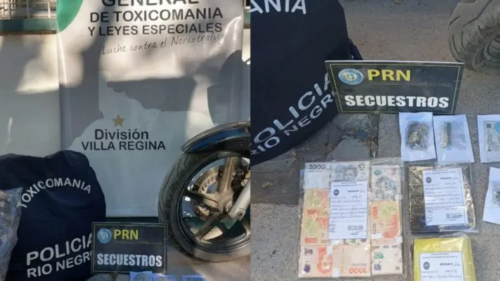 Un hombre con un ladrillo de cocaína, marihuana y dinero en efectivo fue detenido en Villa Regina en el marco de un procedimiento realizado el fin de semana a cargo de la División de Toxicomanía y Leyes Especiales. Según la causa federal el sujeto circulaba a bordo de su moto con aproximadamente un kilo de clorhidrato de cocaína.
