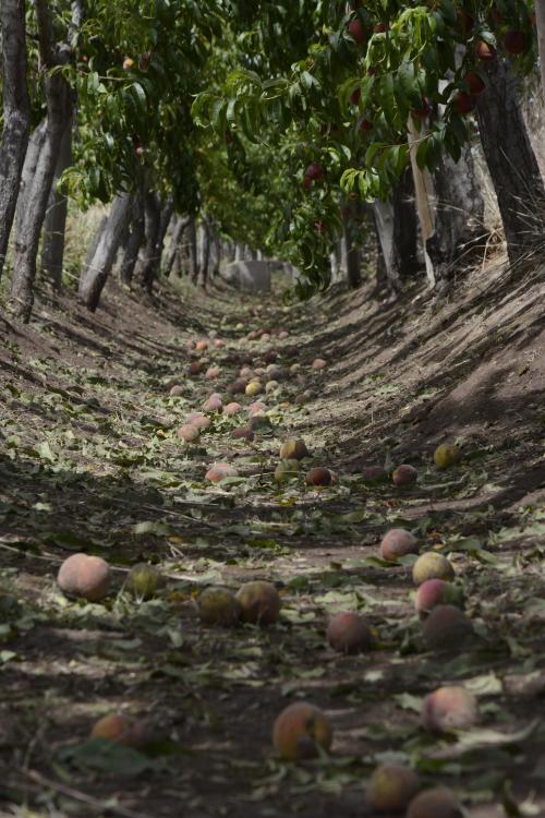 En la zona rural ribereña mostró el panorama es desolador. Hay bronca y desconsuelo. Plantas castigadas, ramas quebradas, frutas marcadas en pie y muchas arrancadas de cuajo y tirada en el suelo. Manzanas y peras apedreadas, duraznos partidos.