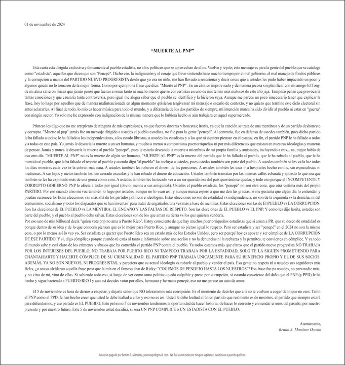 “No me arrepiento de ninguna de mis expresiones, ya que fueron sinceras y honestas; ironía, ya que la canción se trata de una mentirosa y de un partido deshonesto y corrupto. ‘Muerte al PNP’ jamás fue un mensaje dirigido a ustedes el pueblo estadista, no fue para la gente ‘penepé’. Al contrario, fue en defensa de ustedes también, pues dicho partido les ha fallado a todos”, explicó el músico en su extenso comunicado.