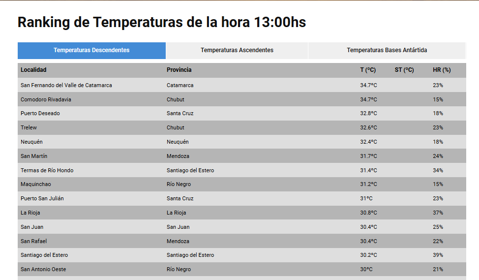 Según el ranking del Servicio Meteorológico Nacional, la ciudad con temperaturas más altas este 26 de diciembre es San Fernando del Valle de Catamarca, al noroeste de Argentina. Esto es algo típico por las condiciones climáticas de la zona.