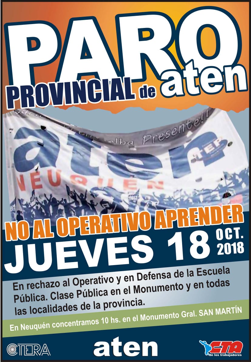 La Asociación de Trabajadores de la Educación de Neuquén (ATEN) realizará un paro el jueves 18 contra el operativo de evaluación educativa Aprender.