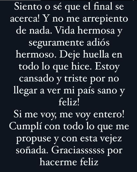“Siento o sé que el final se acerca. Y no me arrepiento de nada. Vida hermosa y seguramente un adiós hermoso. Dejé huella en todo lo que hice. Estoy cansado y triste por no llegar a ver mi país sano y feliz. Si me voy, me voy entero. Cumplí con todo lo que me propuse y con esta vejez soñada. Gracias por hacerme feliz”, escribió el conductor.