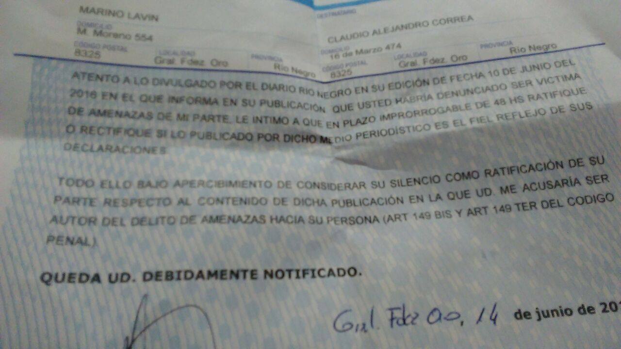 En base a ello, se hizo publico en los últimos días, una carta documento en la que Lavín intima al concejal Correa a que “rectifique o ratifique lo vertido en una nota que publico “Río Negro”, aduciendo que la acusación implica el delito tipificado en el código penal como “amenazas”, bajo el articulo 149. La misiva tiene fecha del 14 del corriente mes y domicilio en la localidad orense.