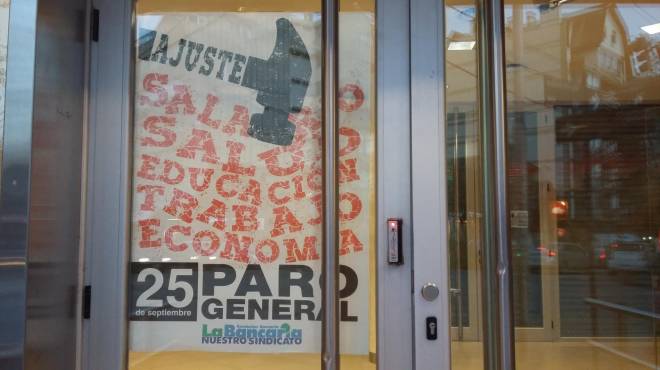 Los bancos lucen carteles con las consignas de la medida de fuerza. No habrá marcha pero sí panfleteada y manifestaciones en diversos puntos.