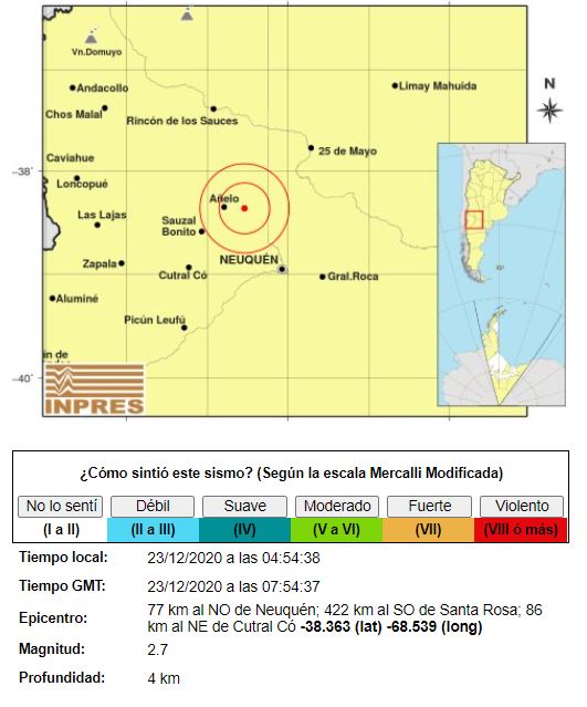 Los tres sismos fueron informados por el Instituto Nacional de Prevención Sísmica (Inpres), el organismo estatal encargado de relevar la actividad del país. Sobre el de hoy, indicó que sucedió a las 4,54. La magnitud fue de 2,7°, como el de ayer a la tarde, mientras que el primero fue de 2,6°.