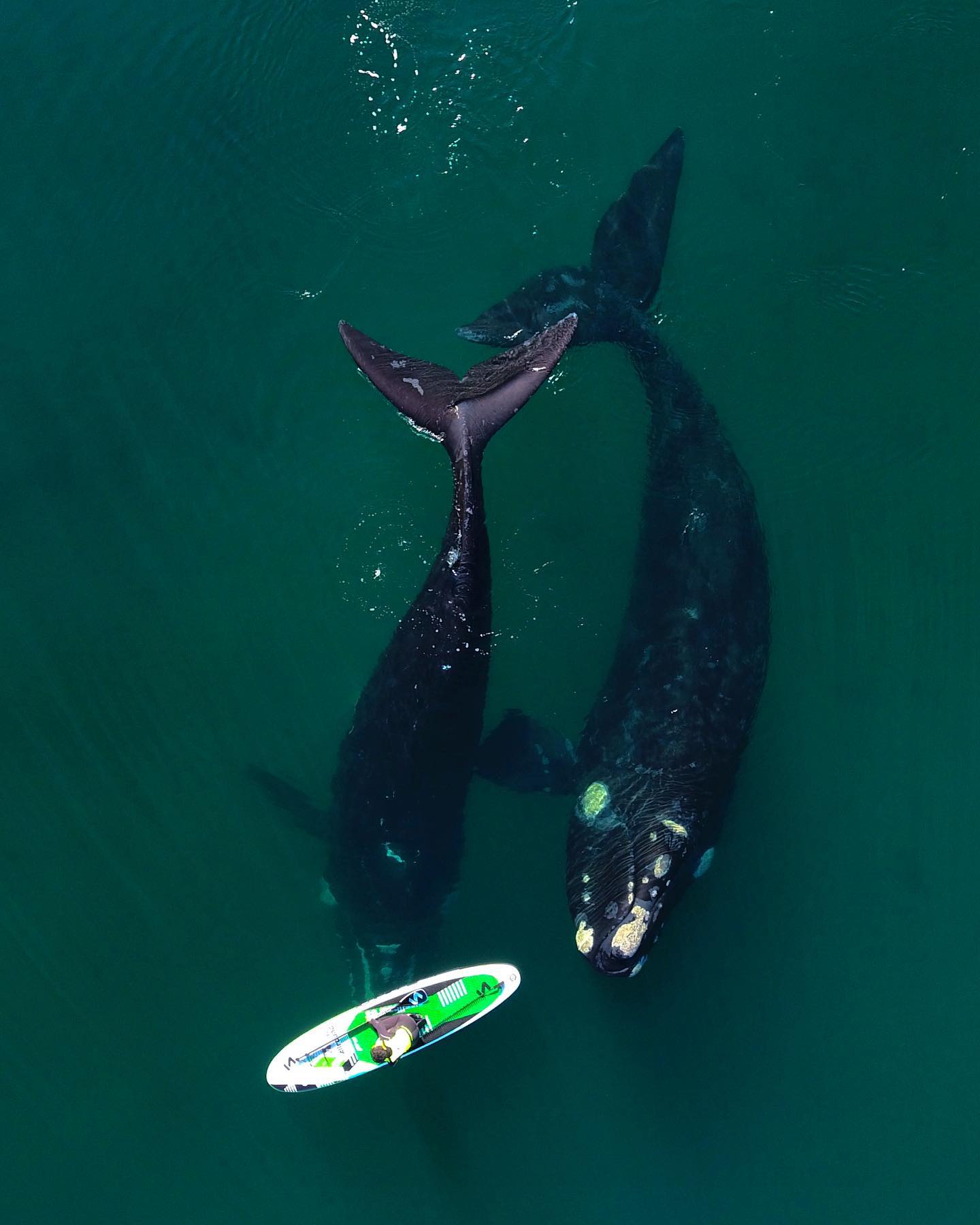 «De hecho el domingo, en mi primera vez sobre una tabla de SUP, había muchísima gente y muchas ballenas, es algo frecuente acá. Ayer, martes, la diferencia fue el día, la claridad del agua y que estaba el drone de genio de Maxi Jonas…», «¿Hasta cuándo nos quedamos con ellas? Hasta las 11.30, teníamos que ir a buscar a los chicos al colegio…», comenta.