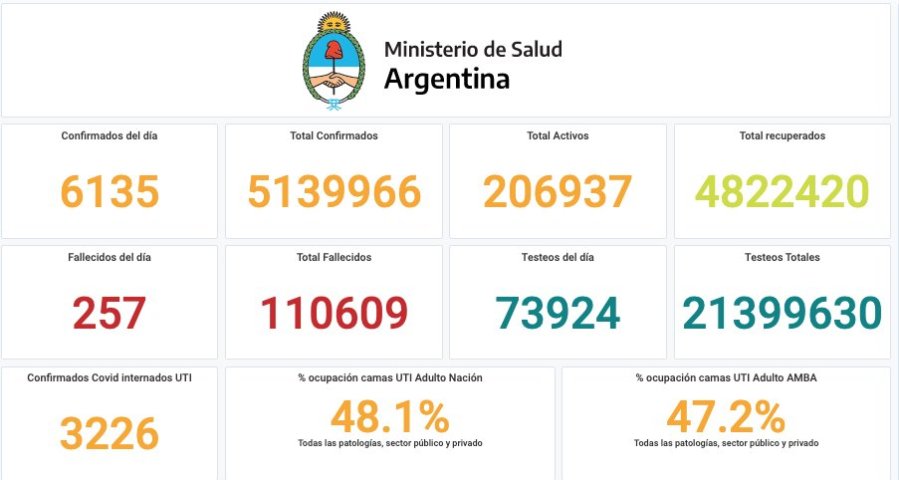 El Ministerio de Salud reportó hoy 257 decesos y 6.135 casos positivos de coronavirus y, con estos datos, suman 110.609 los fallecidos y 5.139.966 los contagiados desde el inicio de la pandemia.
