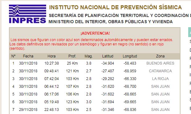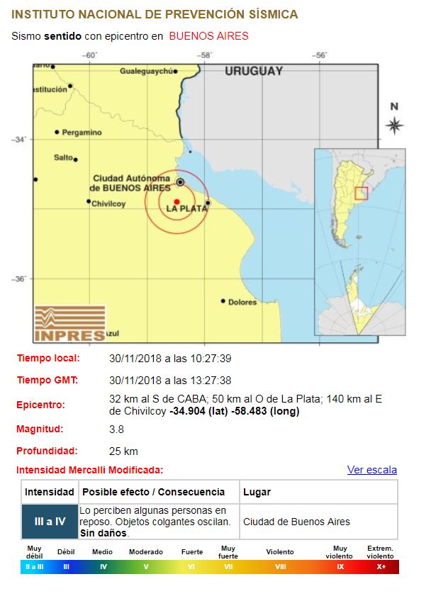 Según el detalle del INPRES, el fenómeno tuvo lugar 32 kilómetros al sur de la Ciudad Autónoma, 50 kilómetros al oeste de La Plata y 140 kilómetros al este de Chivilcoy.