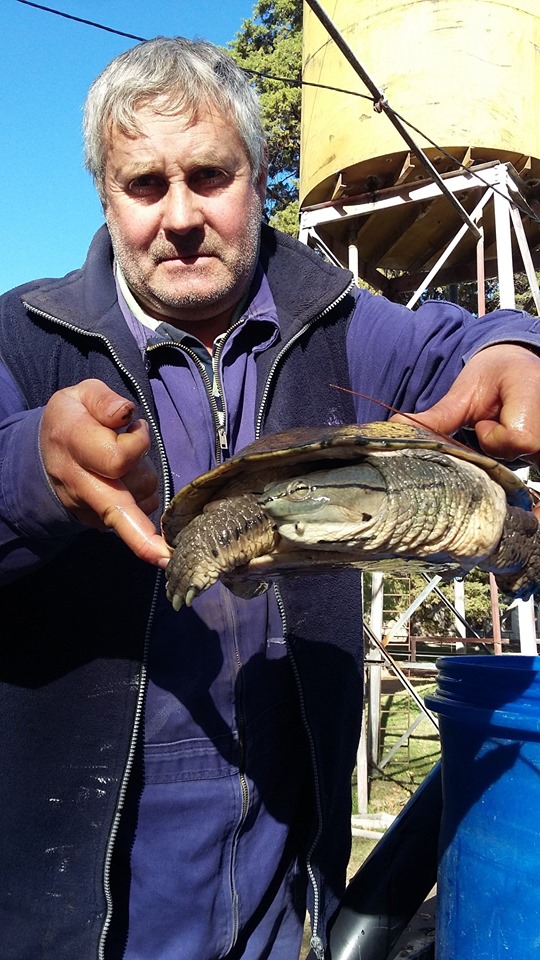 Mientras realizaban esas tareas, descubrieron en el canal la presencia de una tortuga que no frecuenta la región patagónica. Se trata de una Tortuga de Laguna o Campanita (Phrynops Hilarii) de gran tamaño. Es originaria del noeste de Argentina, que habita en las zonas del río Paraná.  Es una tortuga anfibia, que presenta modificaciones en sus extremidades para nadar en el agua dulce, y sólo sale a tierra para tomar sol y calentarse. Si bien, no es una especie en peligro de extinción, temen que no pueda adaptarse a las temperaturas bajas de los ríos de la región.