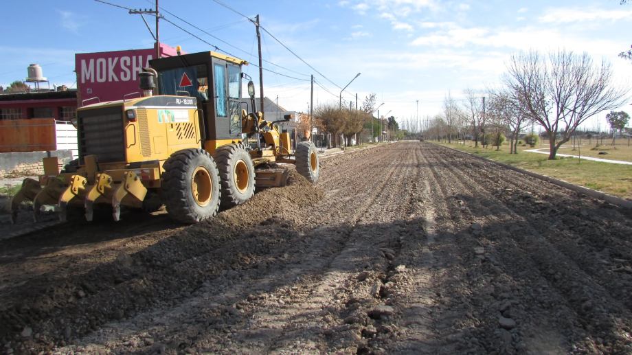 La segunda etapa del plan de pavimentación de calles de la planta urbana de Ingeniero Huergo se puso en marcha esta semana con tareas de preparación del suelo en una de las calles que en los próximos días será asfaltada.