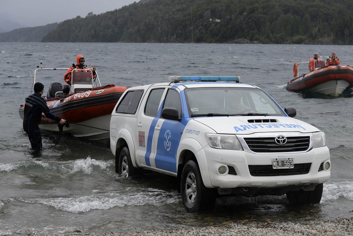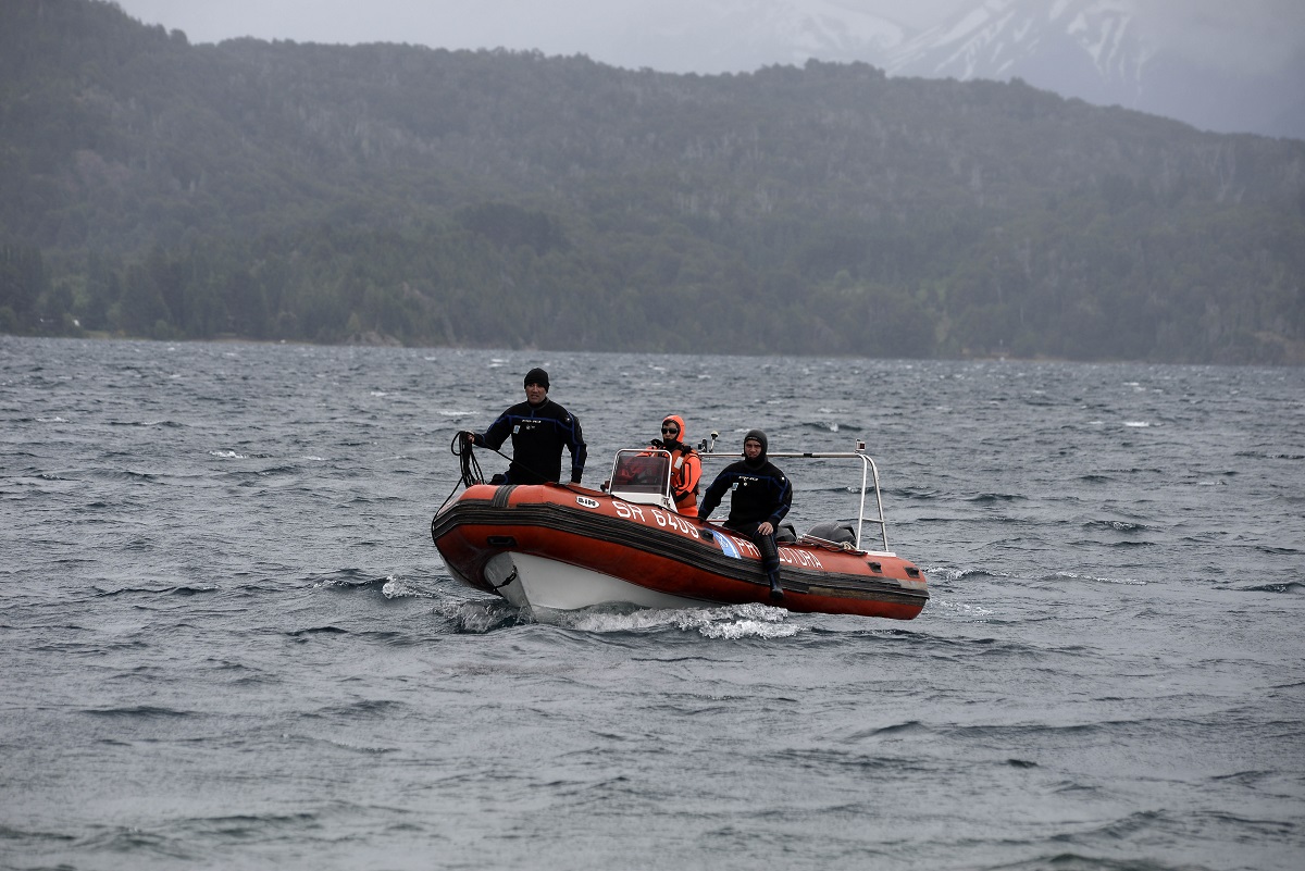 Prefectura desplegó hoy a las 6:30 un grupo de 4 buzos que realizaron tareas de rastrillaje en distintos puntos de la zona de la playa del Viento, a unos 16 kilómetros del centro de Bariloche.