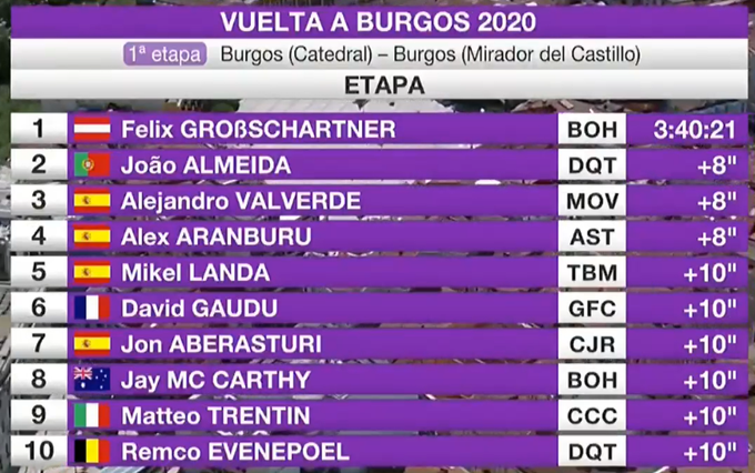 El destacado pedalista argentino diseñó un tiempo que quedó a 8m 21s del ganador de la etapa, el austríaco Félix Grosschartner (Bora Hansgrohe), quien completó el recorrido del primer parcial de la prueba con un tiempo acumulado de 3h 40m 21s. Fue escoltado por Joao Almeida (DQT) y Alejandro Valverde (Movistar Team).