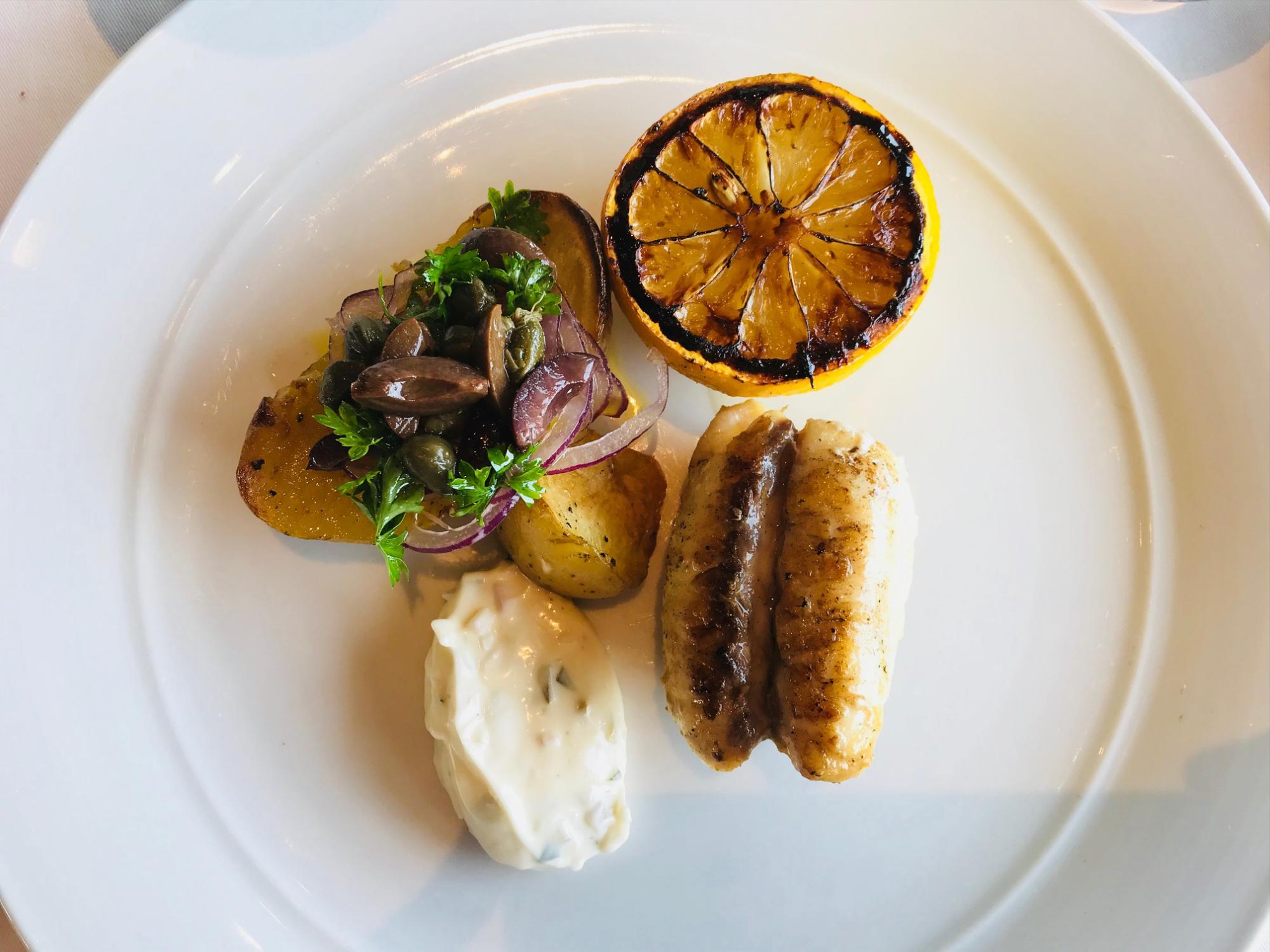 Next: Pesca del día a la plancha, papas rotas y vinagreta de aceitunas y alcaparras sabrosísima y a la hora de los postres dos chances dos.