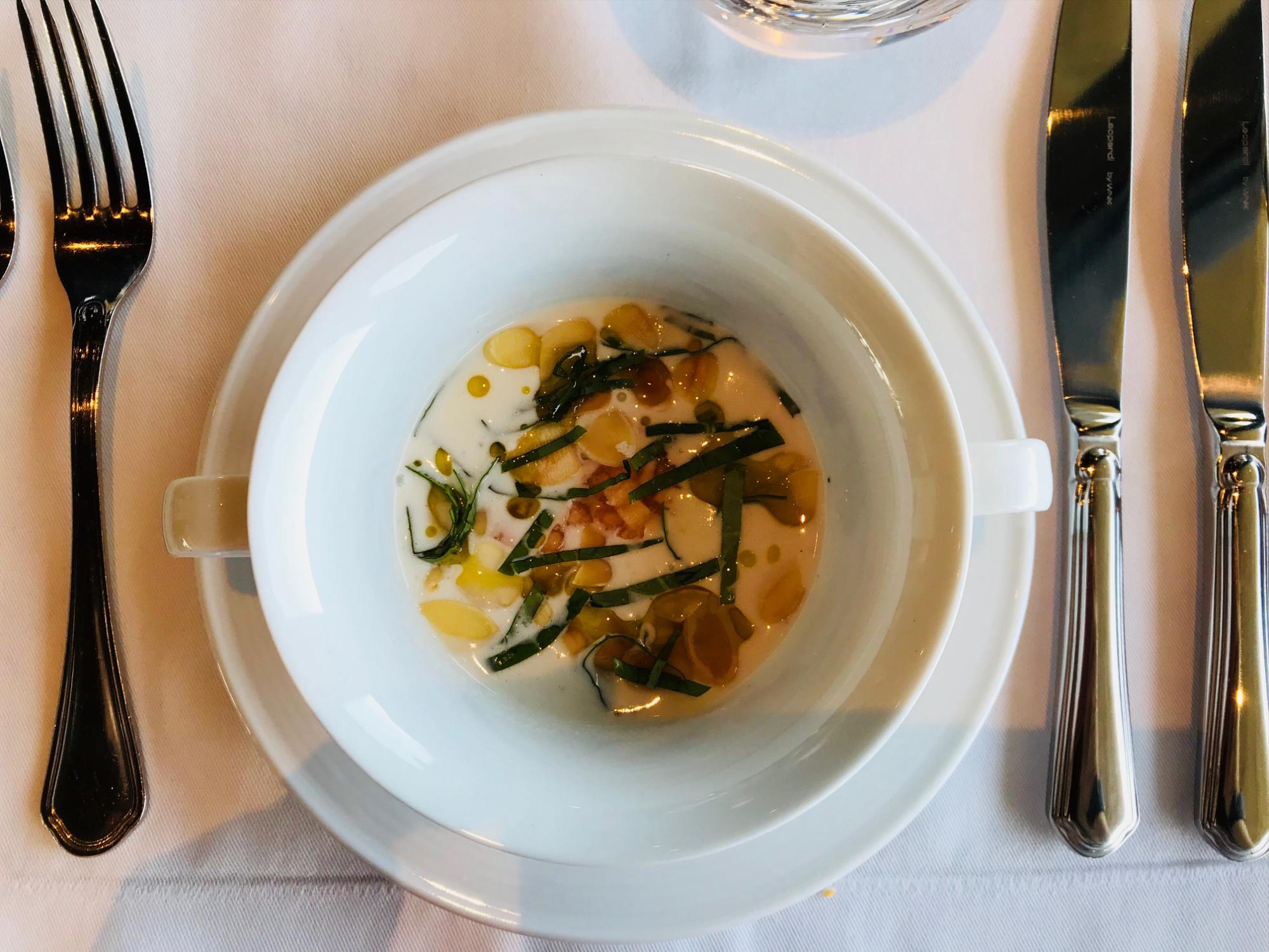 Ajo Blanco, fruta fresca de verano y albahaca, un caldo increíble para abrir un portal sensorial XXL.