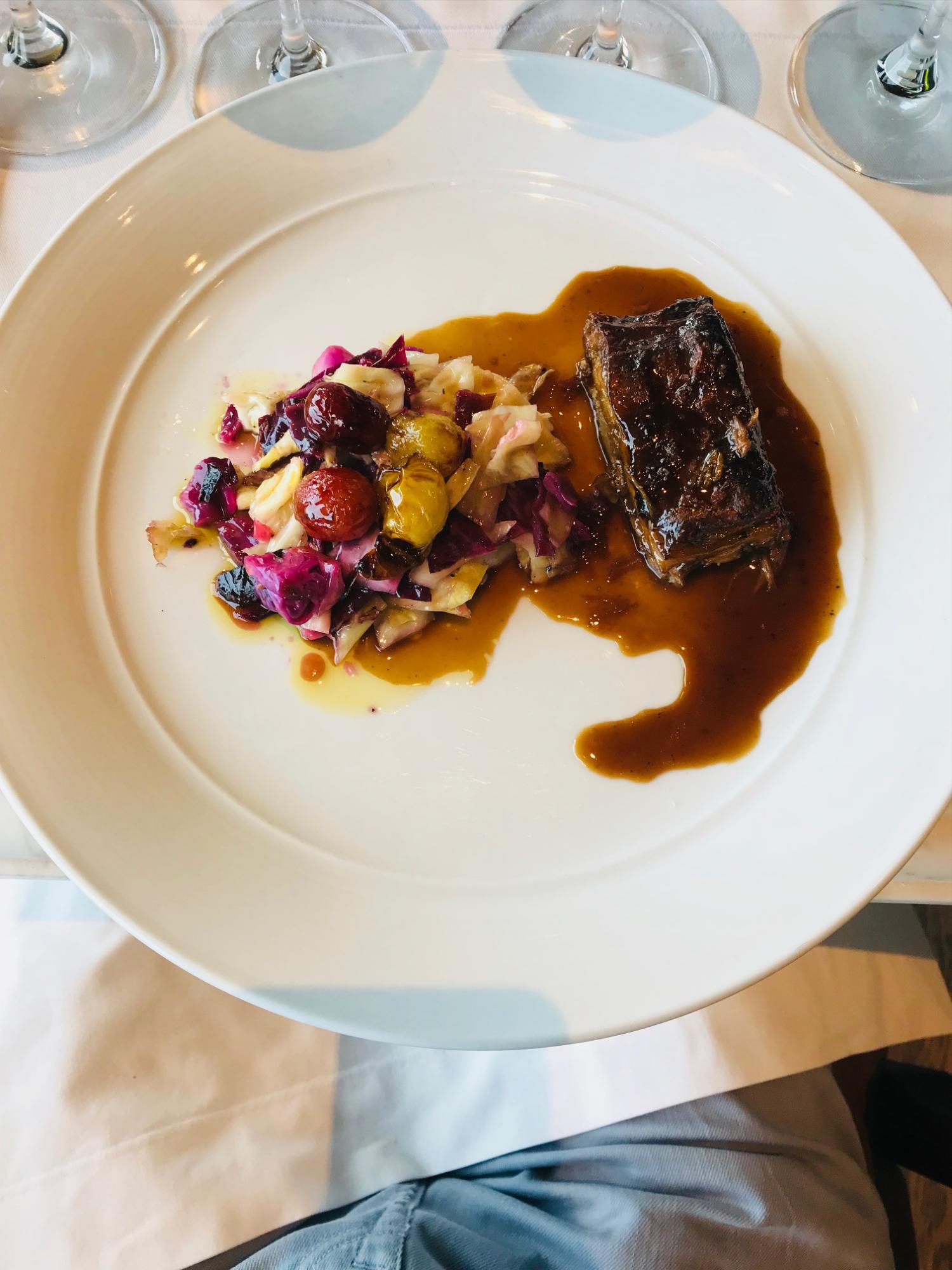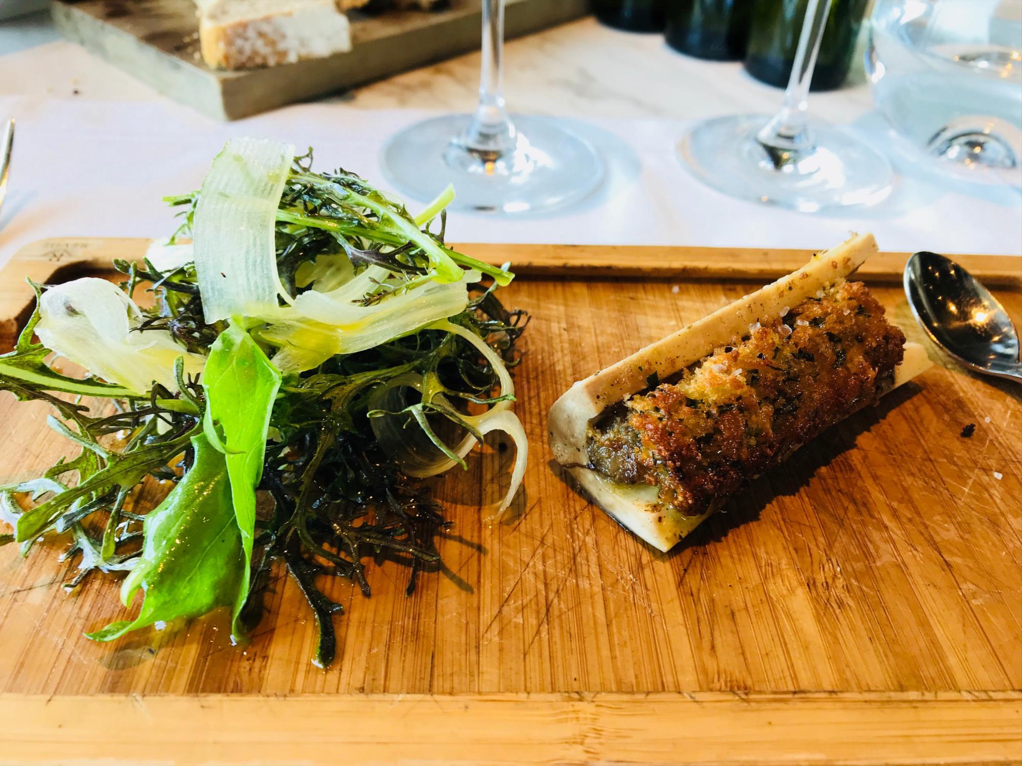 Plato siguiente un caracú al horno cortado hermosamente con costra de hierbas y ensalada de apio. Luego vino lechón a la plancha, fruta asada y ensalada de repollos colgados, una expedición de sabores increíbles con temperaturas despelotadamente hermosas.