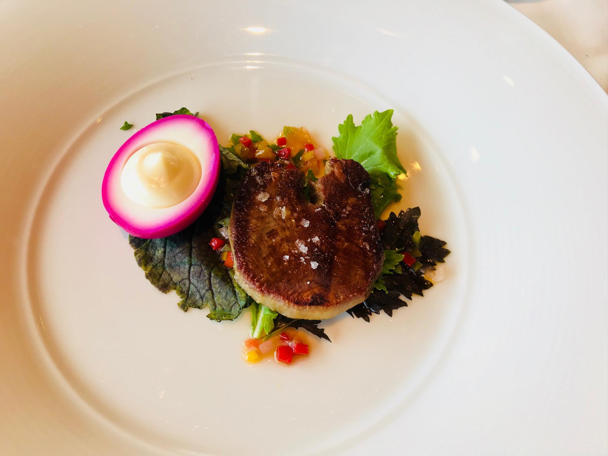 El Caviar de Río Negro, papín aplastado y crema ácida, se tradujo en una sutileza de mar y campo perfecta. Luego choclo quemado, humita mendocina, manteca de especias, agua de maíz y chili. Súper suave, con un picor y dulzor tenue, lleno de vida. En el desfile llegó una lengua ahumada de cordero con salsa criolla y huevo en conserva de color violeta increíble!