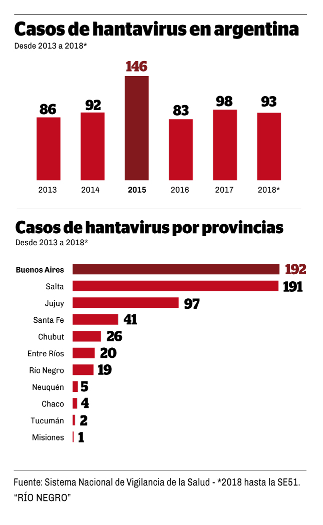 En los últimos seis años, entre 2013 y 2018, Argentina registró 598 casos confirmados de hantavirus en los que la provincia de Río Negro se ubicó en séptimo lugar con 19 casos, según un informe del Sistema Nacional de Vigilancia de la Salud.