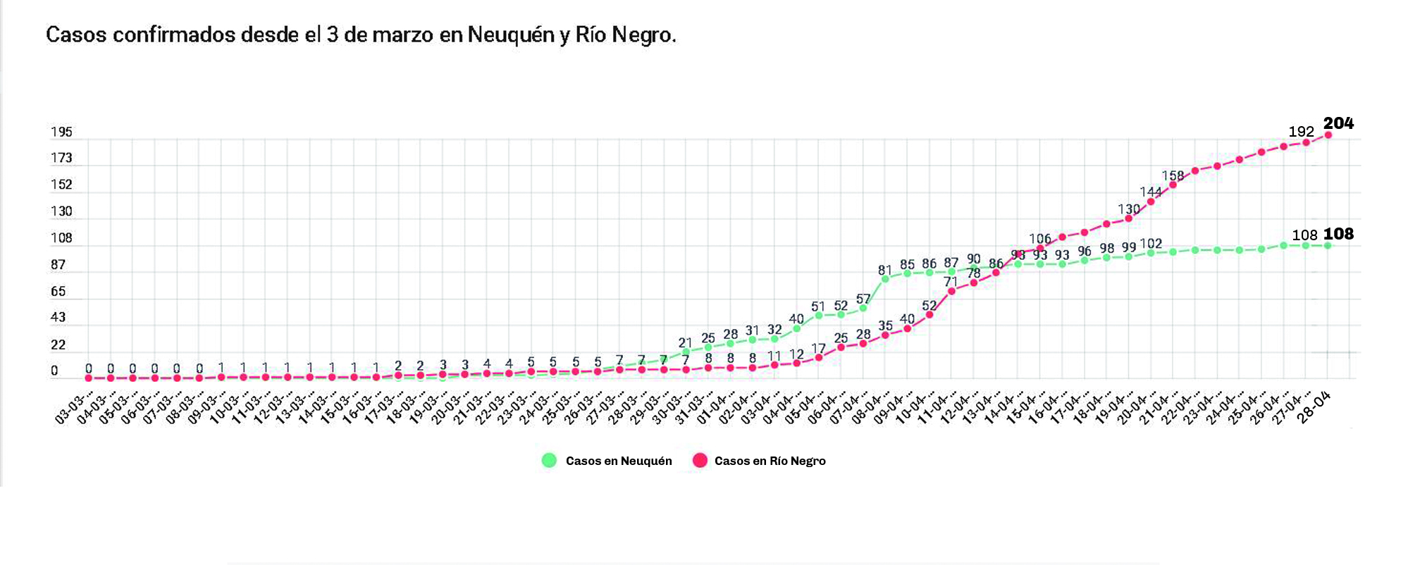Los escenarios son completamente distintos en la evolución de los contagios. Neuquén logró achatar la curva de crecimiento y ayer tuvo por segundo día seguido cero contagios. En cambio Río Negro llegó a 204 según el ministerio de Salud rionegro, con otros 12 enfermos en la jornada de ayer, la mayoría de ellos en el Valle Medio.