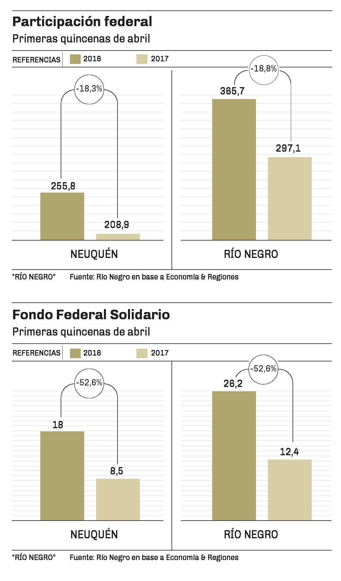 En la primera quincena de 2017 llegaron a las arcas rionegrinas por estos dos conceptos algo más de 309,5 millones de pesos, cifra que refleja un desplome del orden del 21% cuando se la relaciona con los ingresos del mismo período del año anterior. En valores absolutos, esta caída representa 82 millones de pesos, en solo 15 días del año.