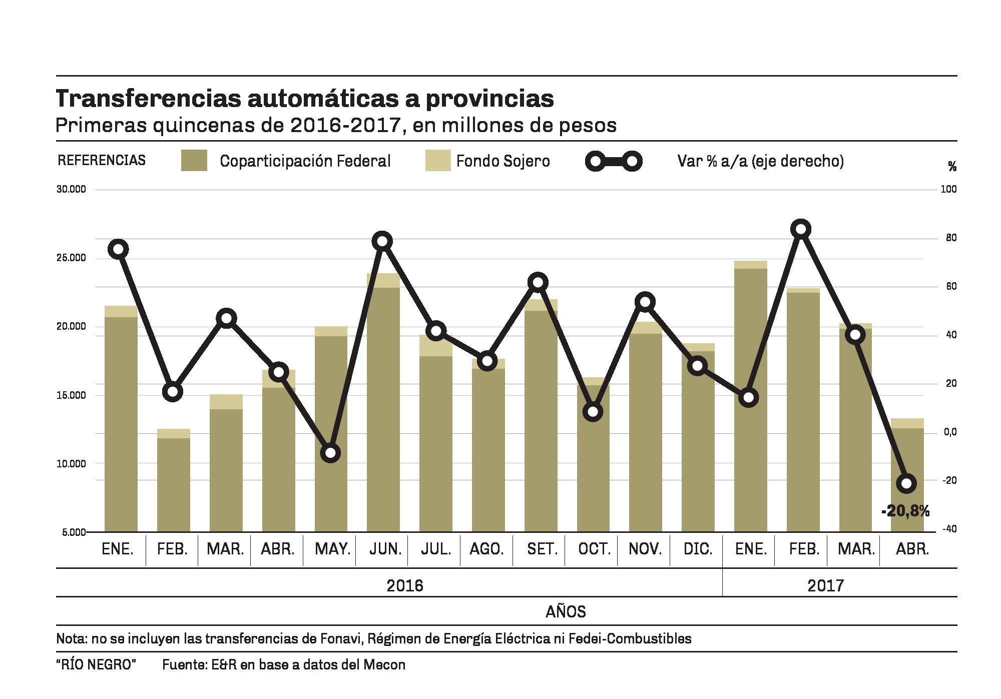 Si bien los valores son importantes, el estudio de E&R resalta que las proyecciones para todo abril no serán tan negativas, ya que es posible que exista una recuperación en la segunda quincena que permita revertir este escenario. Las optimistas proyecciones para todo el mes en curso muestran un crecimiento global sobre las transferencias nacionales del orden del 23% interanual, un número relativo que igualmente se ubica por debajo de los índices de inflación. Por lo tanto, en valores reales la administración rionegrina percibirá menos recursos por estas partidas respecto de abril de 2016.