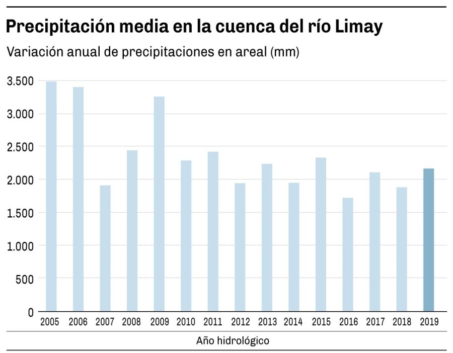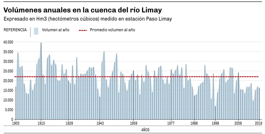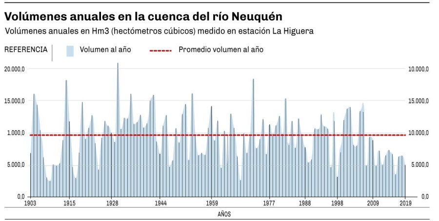 Dijo que del análisis de la serie con los datos de caudales de los ríos se observa que desde el 2008 el Limay y el Neuquén vienen muy por debajo de la media. Las causas: escasez de nieve y lluvias.