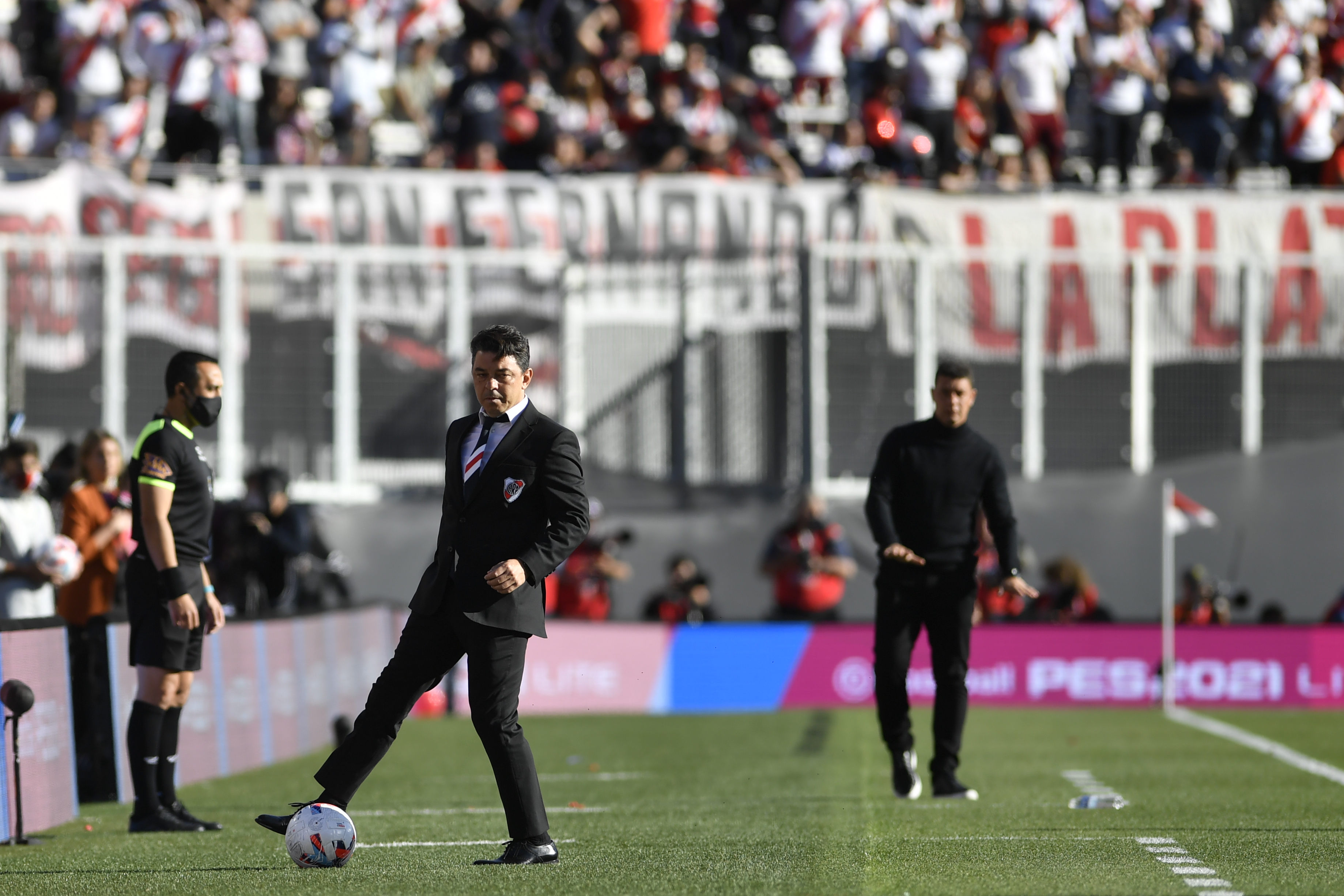 En la vuelta al Monumental con gente en las tribunas, el Muñeco evocó a Ángel Labruna al salir a la cancha con traje negro y con la banda roja cruzada en la corbata, tal como lo hacía el icono millonario en su etapa como DT.