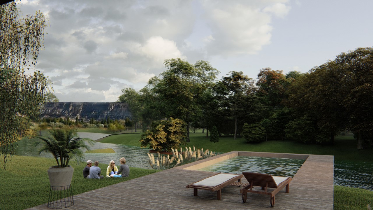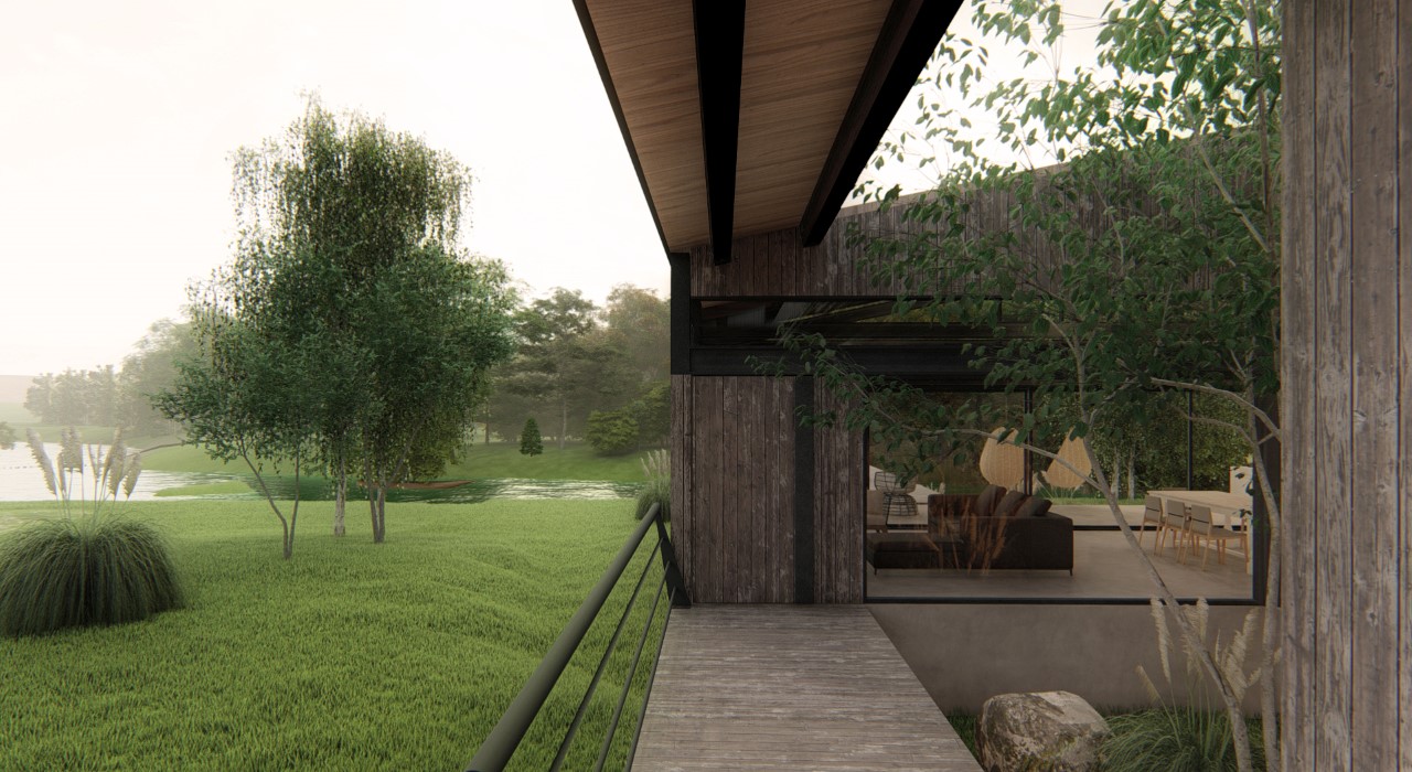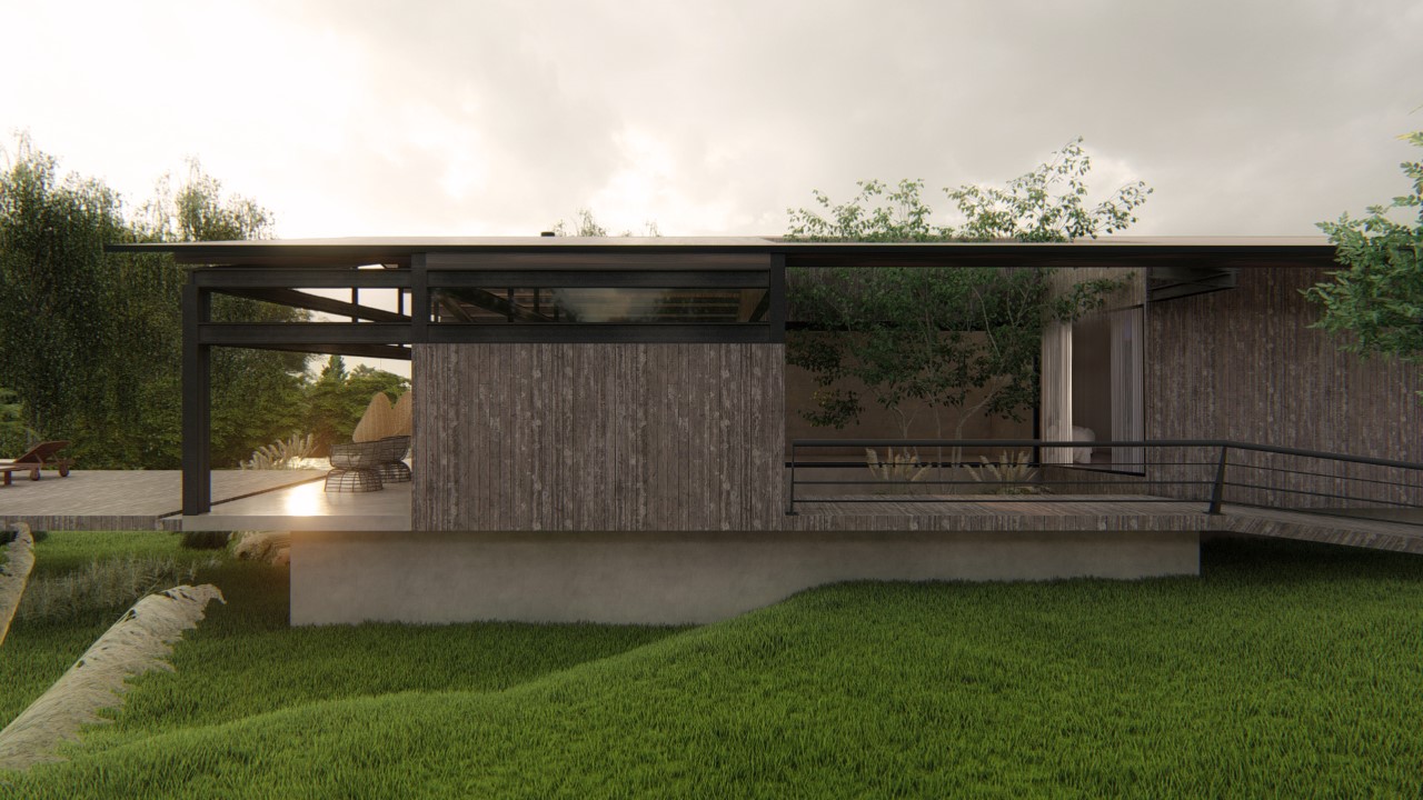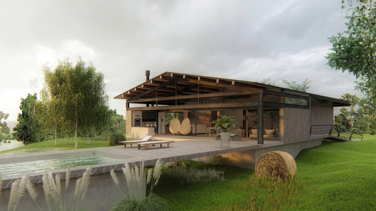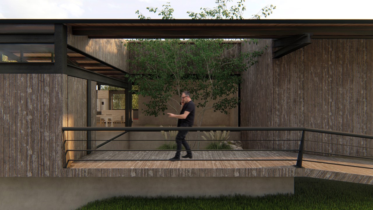 Es así como aparece la propuesta de una planta, que se articula por medio de un puente de madera, que trata de mimetizarse con el entorno, quedando así suspendida la volumetría mediante una platea en voladizo y la geometría será la que vaya definiendo y descubriendo los espacios. A la vivienda se accede por este puente cuyo recorrido determina un patio que actúa como nexo entre lo público y lo privado. En forma lineal, el puente se lee volumétricamente hasta desembocar en la piscina y el río.