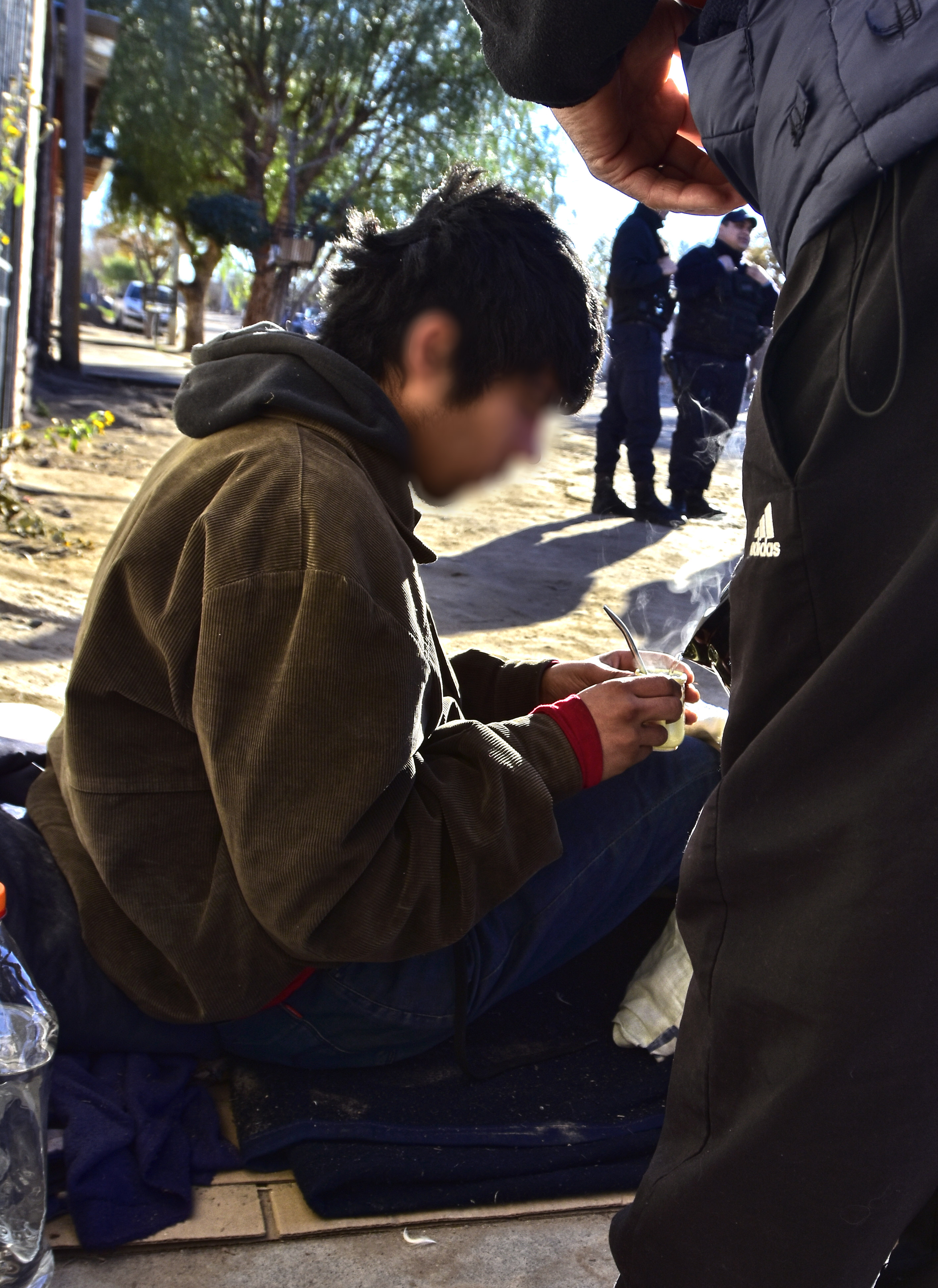 Jorge Painevil es el dueño del mate y con un termo en la mano intenta contener al muchacho de 21 años que se está despertando de un largo y helado sueño. “Vive a unas cuadras de acá. Apareció muy golpeado y nos contó que alguien de su entorno le pegó mucho. Nos impactó que se acueste a dormir arriba de un cartón”, reveló esta persona, todavía consternada con la historia.