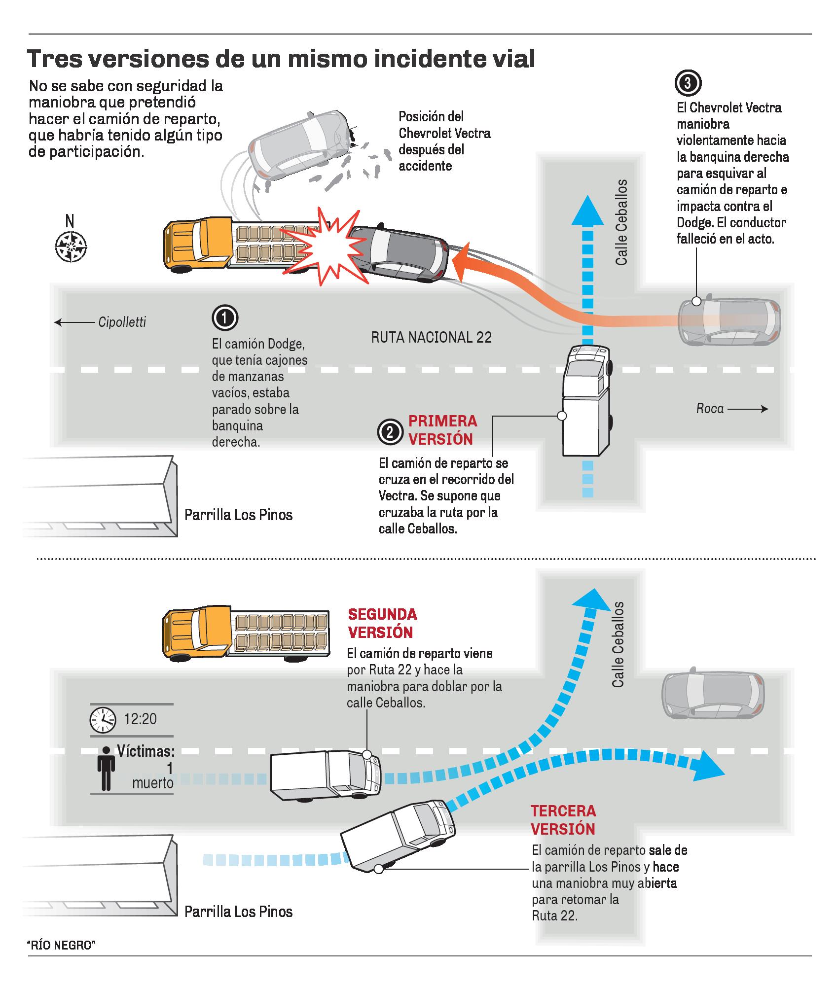 En principio hay tres hipótesis (ver infograma adjunto) sobre las que estarían trabajando los peritos. Todas apuntan a una mala maniobra de un tercer camión involucrado (foto), que hizo que Becerra intentara el escape hacia la banquina donde se encontró con el camión Dodge estacionado. Ese tercer vehículo, utilizado para repartir lácteos, permanecía ayer estacionado sobre calle Bolivia, frente a las oficinas del cuerpo de Seguridad Vial de Roca.