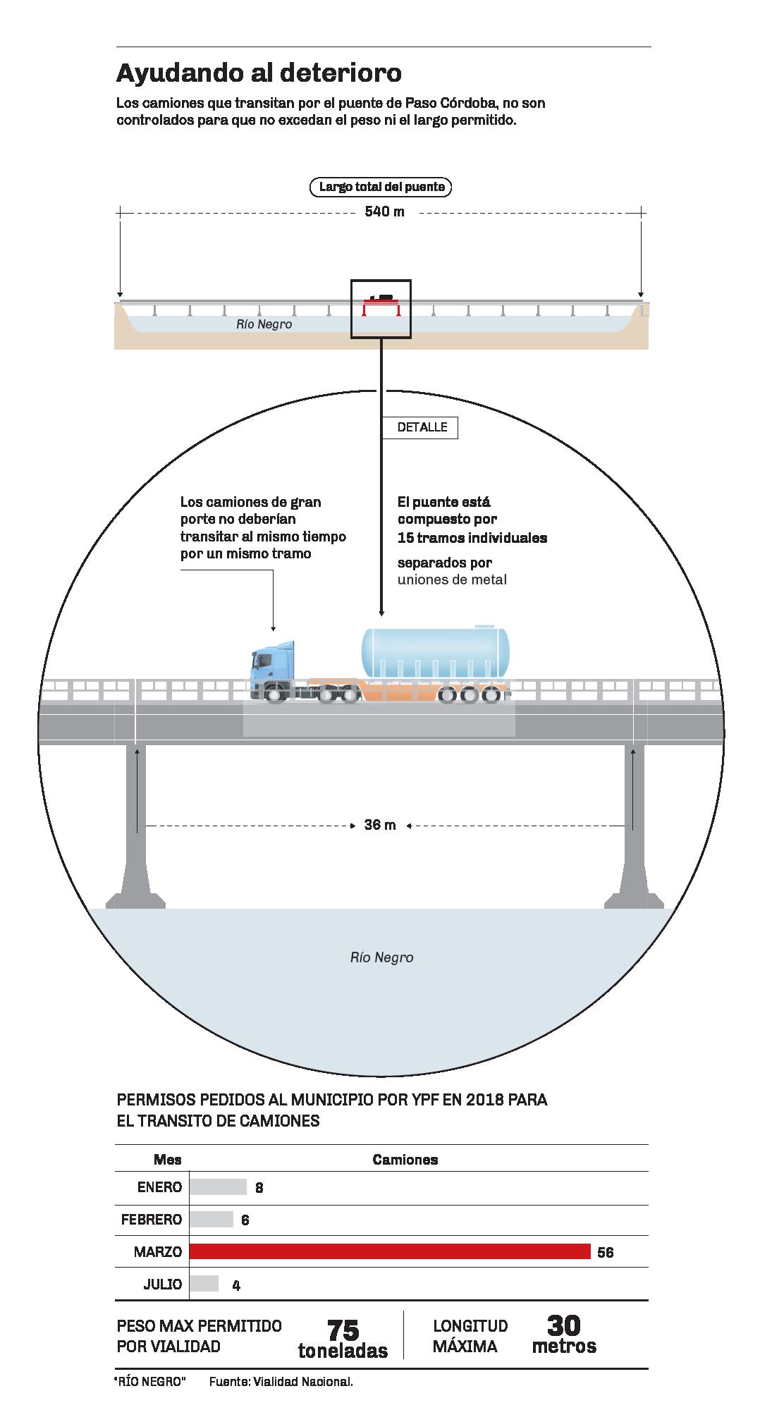El puente de Paso Córdoba se convirtió en un importante acceso a la provincia, tanto como forma de comunicación interna como para el comercio. A diario circulan cientos de pequeños y medianos vehículos pero, desde diciembre del año pasado, decenas de camiones de carga de YPF comenzaron a transitar con el objetivo de acceder a la nueva perforación experimental en el ejido de Allen. Se trata de la Estación Fernández Oro, ubicada en el margen sur de Río Negro.