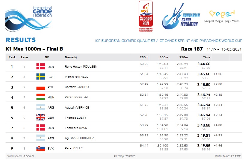 El palista de la comarca Agustín Rodríguez finalizó octavo y Agustín Vernice se ubicó sexto en la Final B de K1 sobre 1.000 metros que se disputó en Szeged (Hungría) y corresponde a la primera fecha de la Copa del Mundo de canoaje en la modalidad velocidad.
