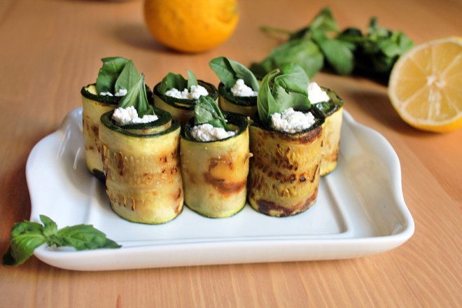 En un bowl pisamos y deshacemos la ricota con un tenedor y la mezclamos con unas gotas de limón exprimido y pimienta negra. Extendemos las lonchas de calabacín y ponemos una cucharada de ricota en el extremo de cada una, a continuación una hoja de espinaca, una hoja de albahaca y enrollamos el resto del calabacín.